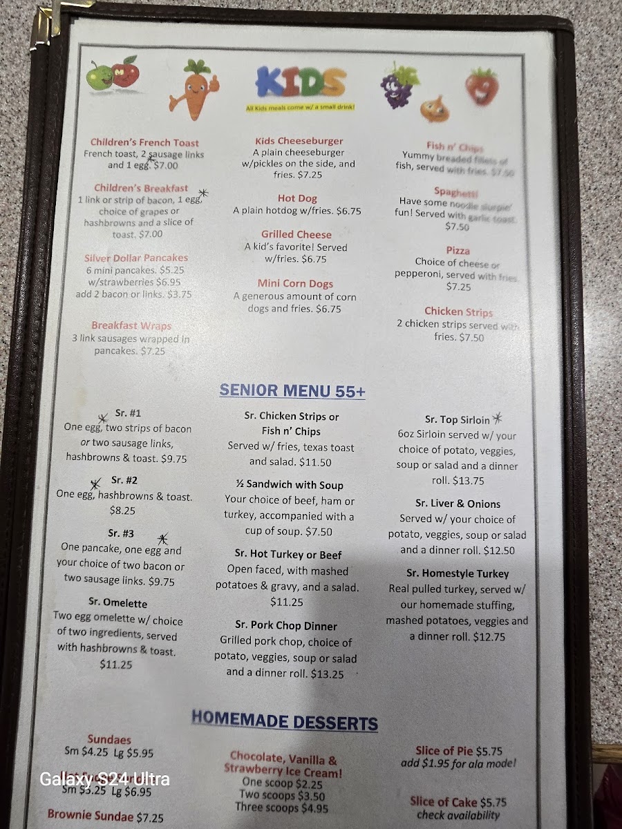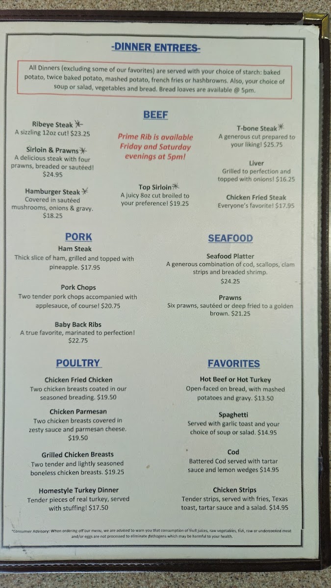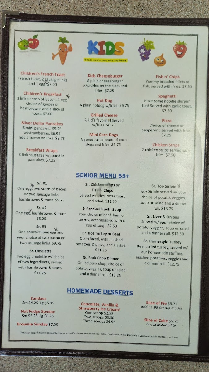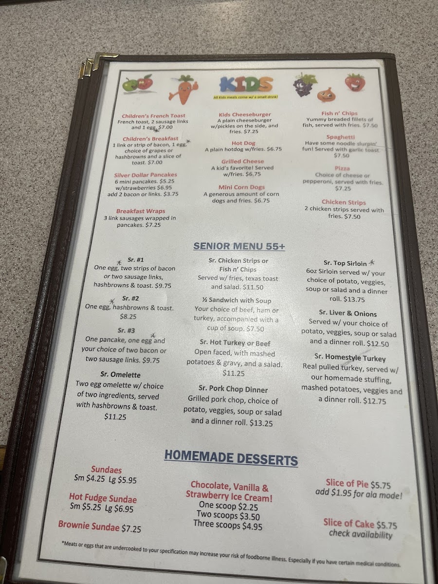 The breakfast offerings include traditional favorites like Chicken Fried Steak Breakfast, French Toast, omelettes, and biscuits and gravy—perfect for starting the day with a generous, warming meal. Midday and evening menus feature a range of simple, well-prepared sandwiches such as the French Dip or Chicken Sandwich, as well as more substantial plates like Ribeye Steak, Pork Chops, and classic home-cooked dinners.
